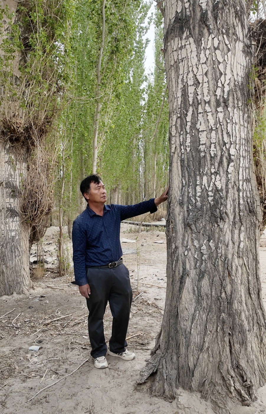 在第一批树苗中,有一棵箭杆杨(学名穿天杨)顽强地存活下来。这存活下来的“第一棵树”被当地人称为“树王”,如今这棵白杨已经长到三米多粗、四十多米高,树干坚实不空,依然枝繁叶茂。“父亲看待这些树,就像看待自己慢慢长大的孩子。”付国喜说。